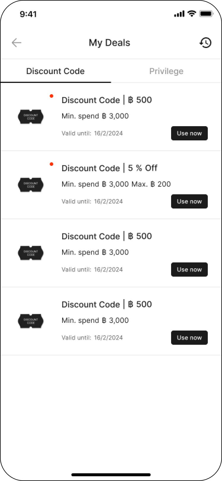 A successfully redeemed code will be displayed in Discount code & Deals page.