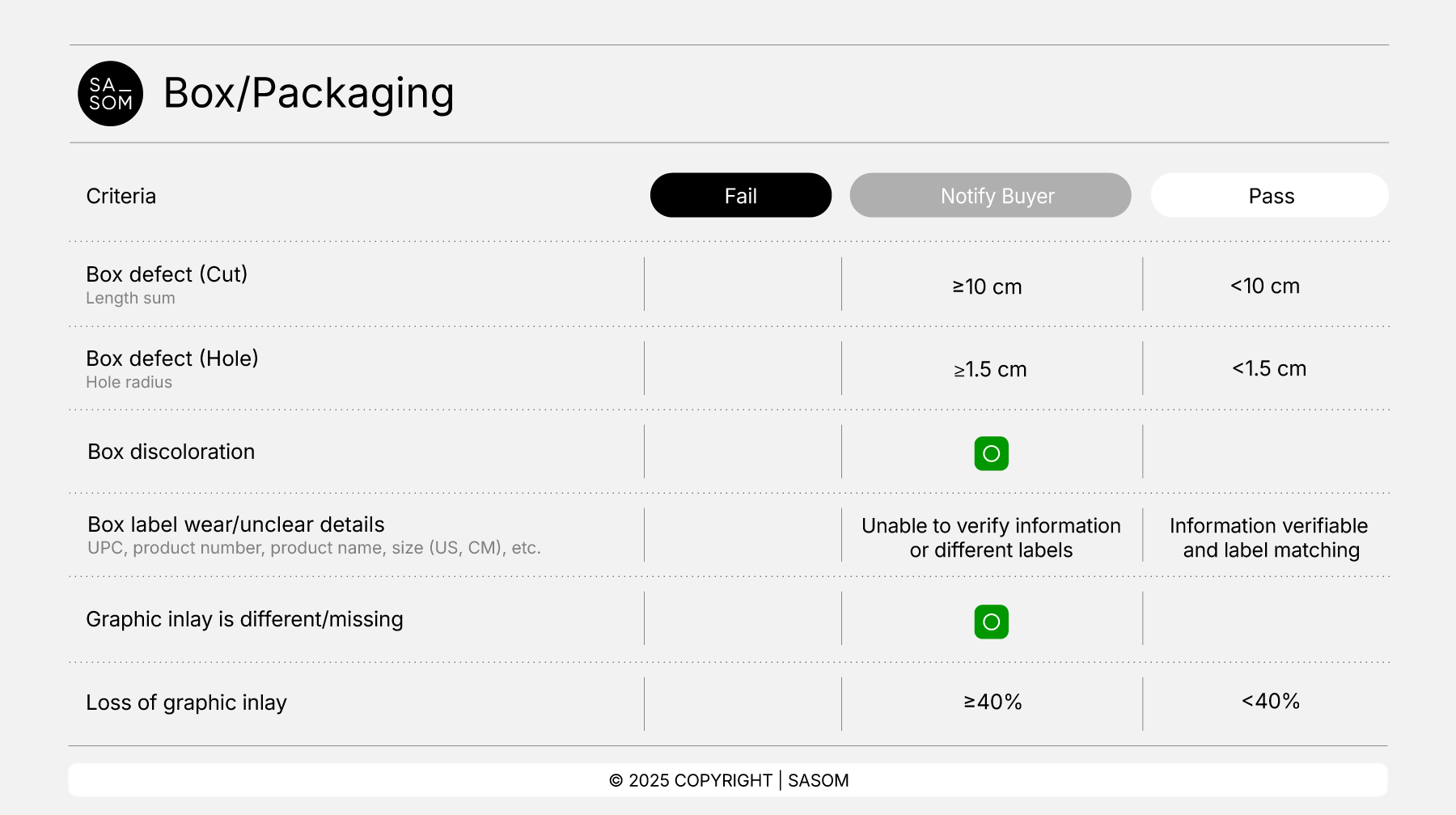 In addition to the criteria outlined by SASOM's authentication standards, products that are not recognized as defective by the manufacturer for the reasons listed below, or products that cannot be clearly identified based on our authentication standards, will not be considered defective. As a result, purchase cancellations will not be allowed for these reasons.