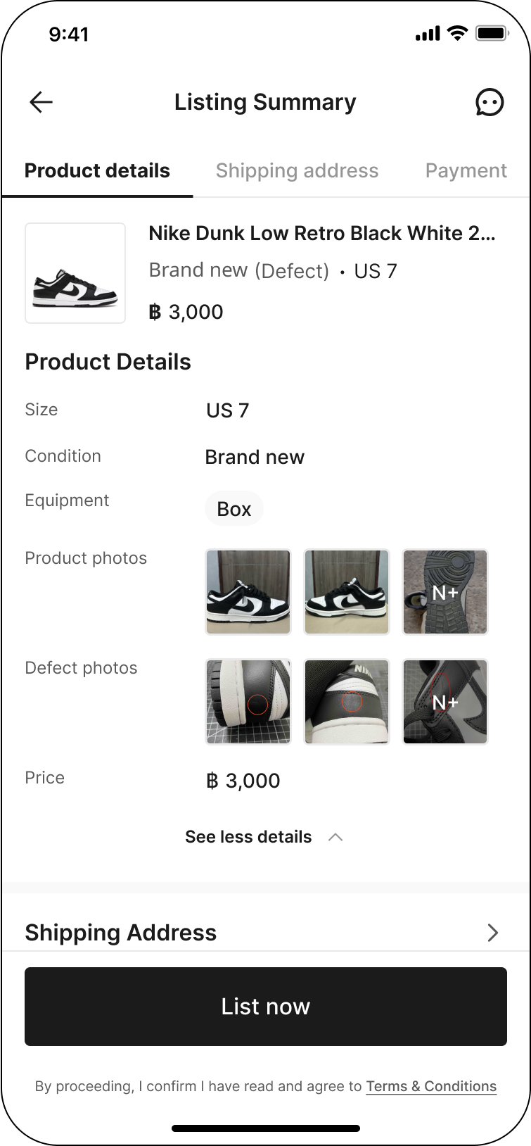 Review the product details of your listing, fill in your shipping address and select payout method. Then, click ‘List now’.