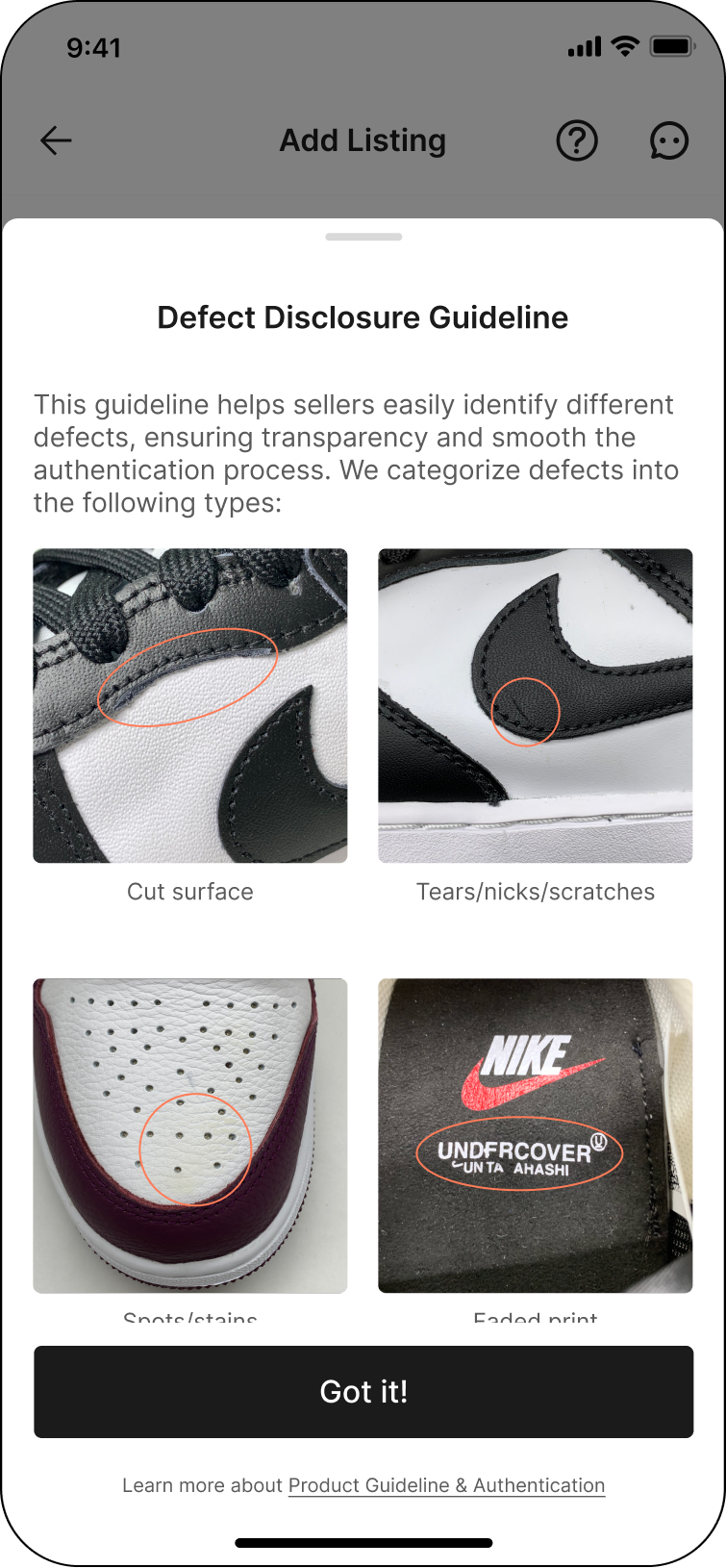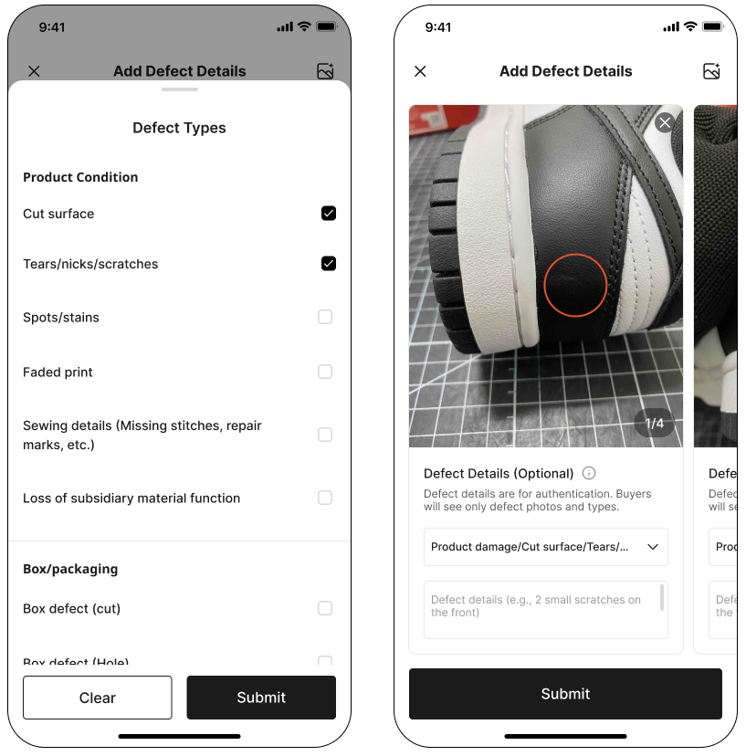 If your product has any defects, please upload clear photos of the defects. For defect photos guidelines, click the 'ⓘ' icon next to the 'Defect details' title.