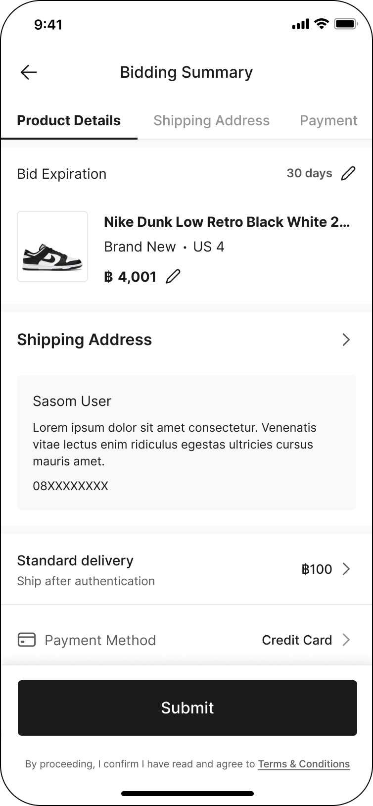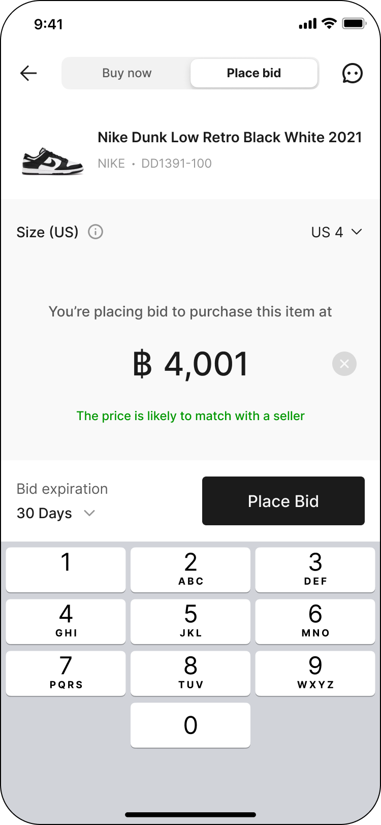 Select the product size, enter the price you would like to bid, choose the Bid expiration period (7 days, 14 days, or 30 days), and click ‘Place Bid’ to proceed to the Bidding Summary.