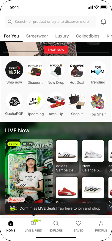 You can also find LIVE sessions that appear on your 'For You' home page, search results, product details, and the 'LIVE' tab on host profiles.