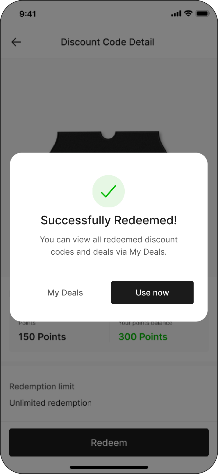Step 4: After successfully redeemed,You can select between ‘Use now' or 'My deals’ for view redeemed discount codes and deals