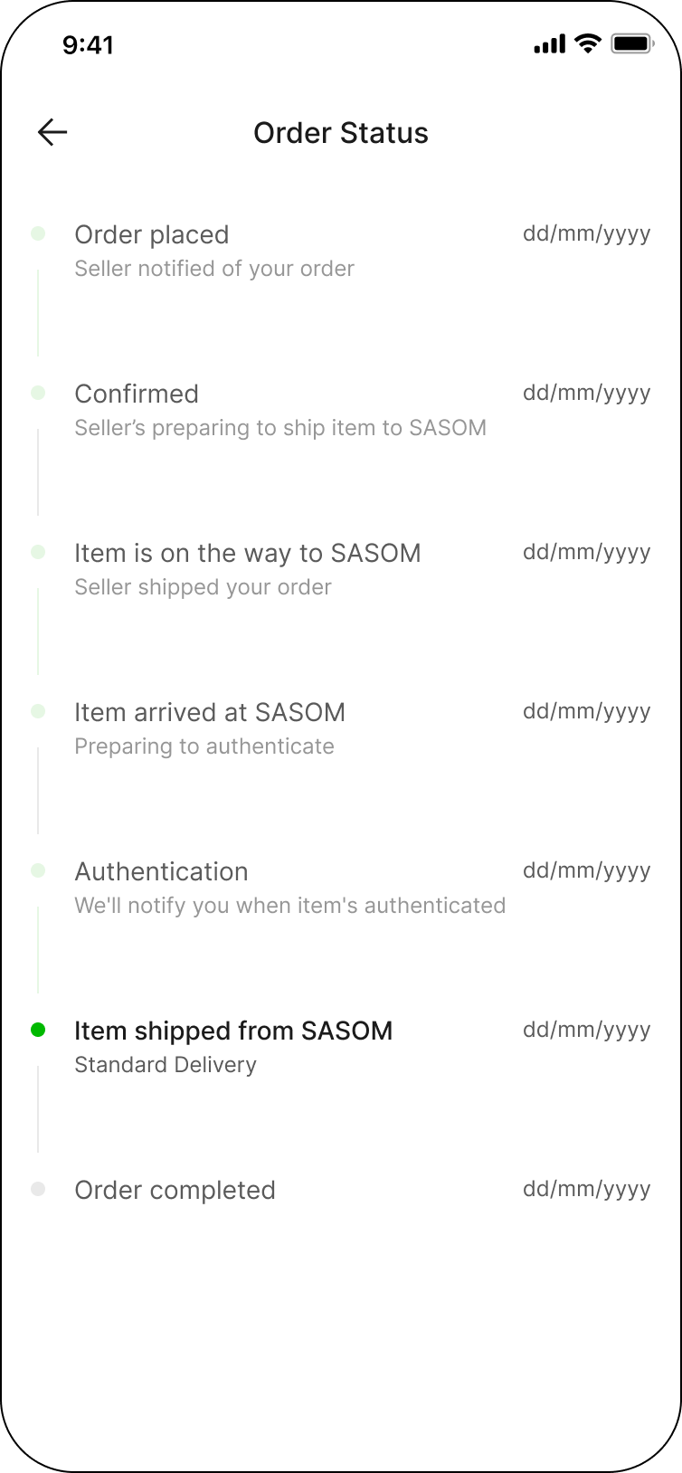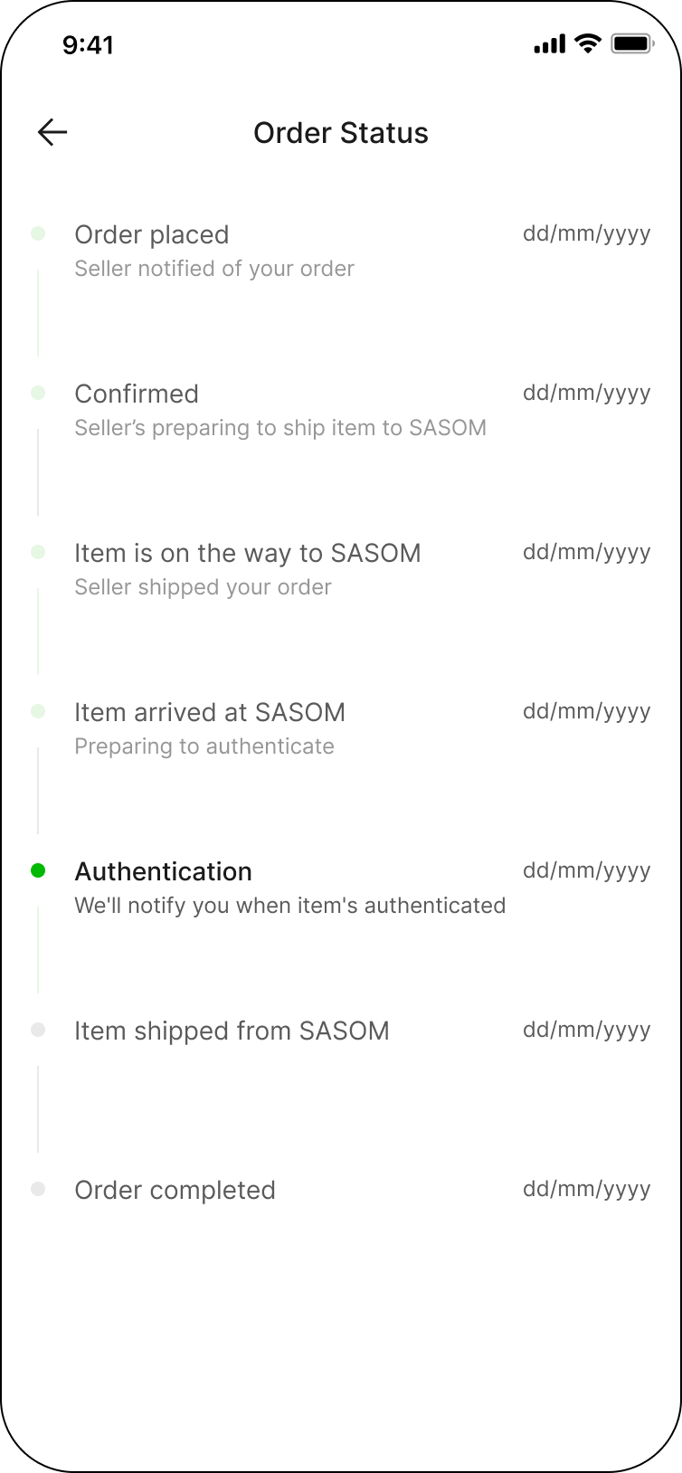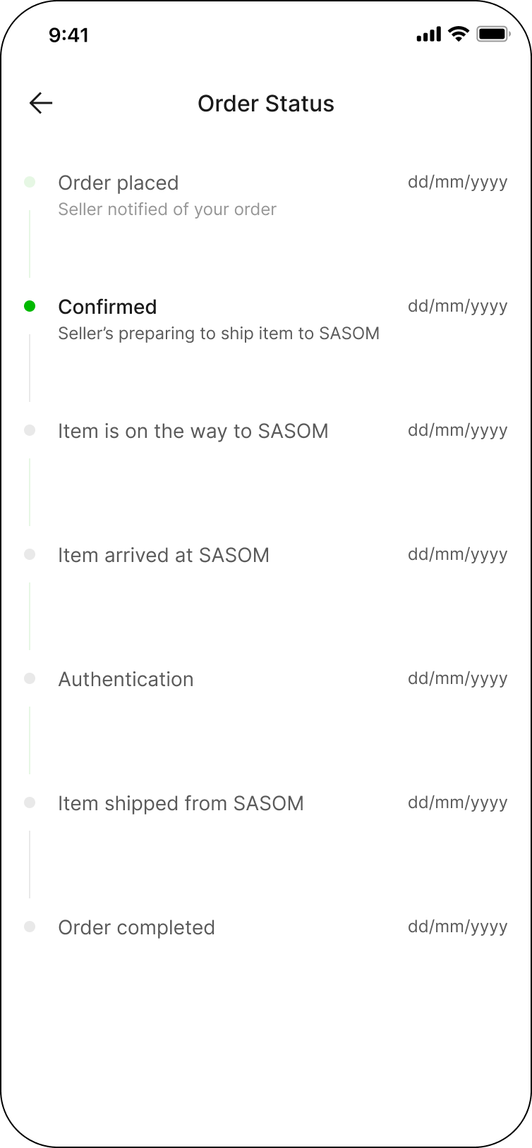 Confirmed order status contains orders that are in progress, which includes the process from seller shipment to SASOM, authentication, and shipping item from SASOM to buyer.