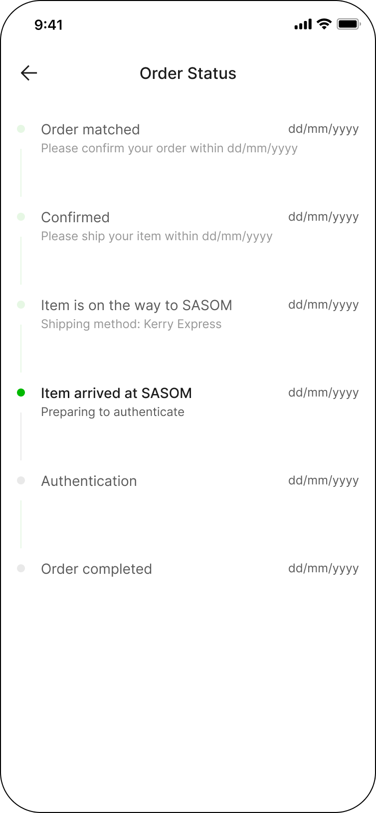 After you confirm your order, please ship your item to Sasom within 48 hours via shipping method you’ve selected. You can track shipping status via provided Tracking Number, which will be available within 24 hours after the shipment is processed.