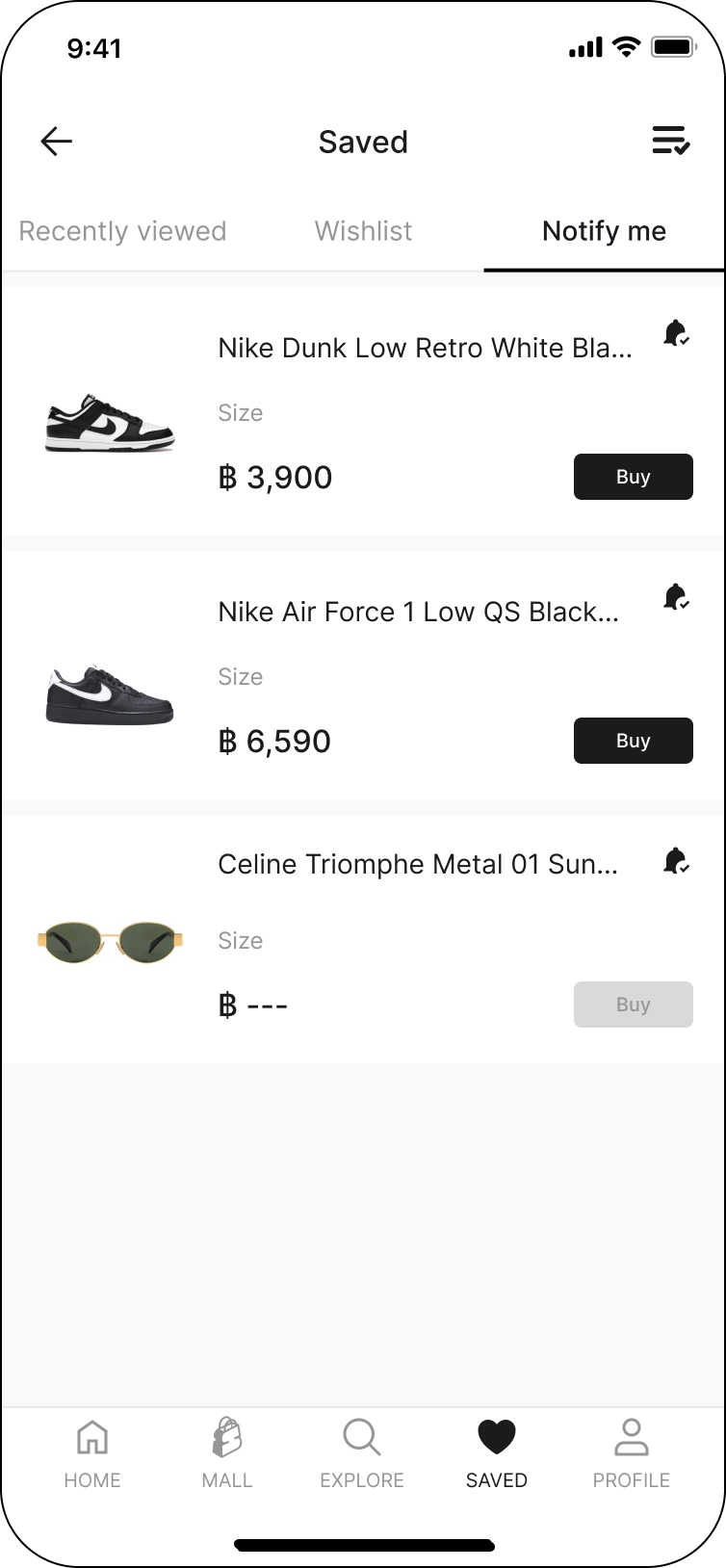 The 'Notify Me' feature allows you to save your interest items and receive notifications when the price updated. You can add items to your saved by simply clicking on the product detail page.