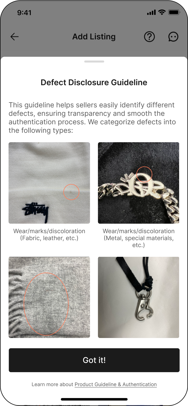 คลิกไอคอน 'ⓘ' เพื่อดูแนวทางการในการถ่ายภาพตำหนิของสินค้า